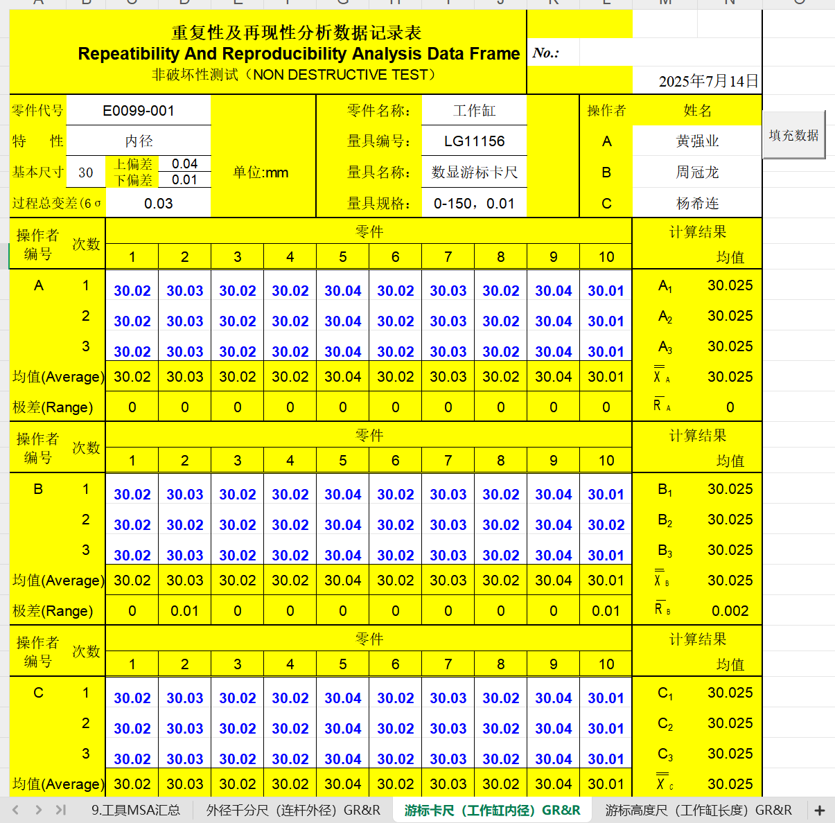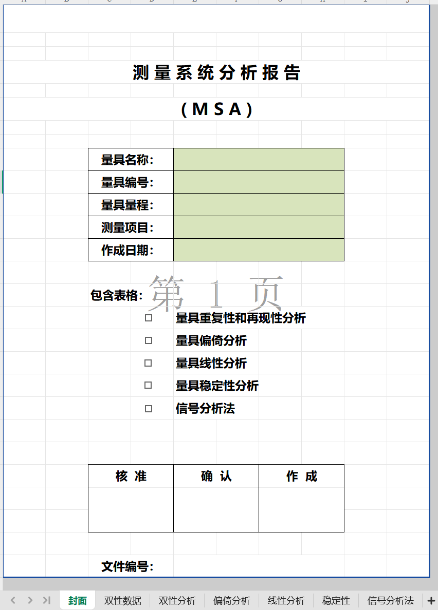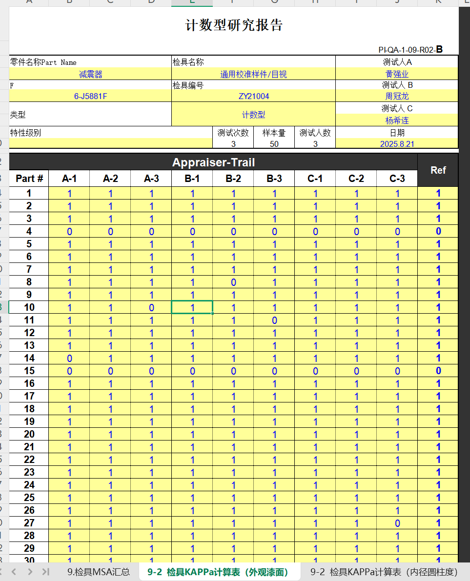 三份个人平时常用的用来进行测量系统分析(MSA)的Excel表单,其中模板一包含五性一力,模板二涉及量具GR&R计算,模板三涉及KAPPa计算,各位老师请按需下载评价,谢谢!